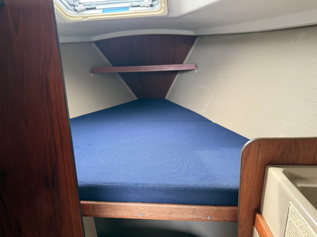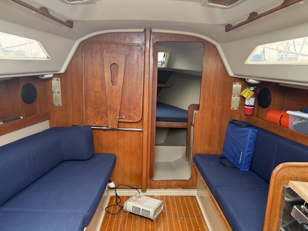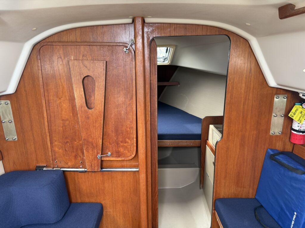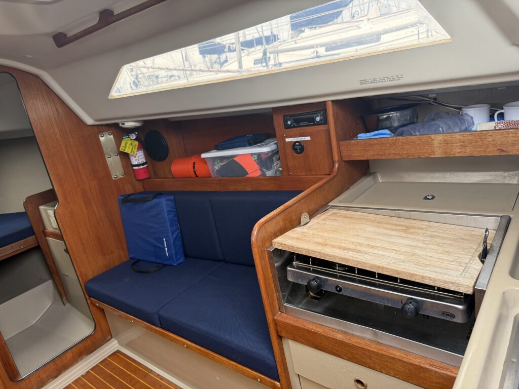Down below, Blew Moon has a full interior: v-berth forward, settee and dinette with a fold-down teak table, a galley with a two-burner propane stove, and a head. A comfortable first boat that won’t feel like a compromise on the water.