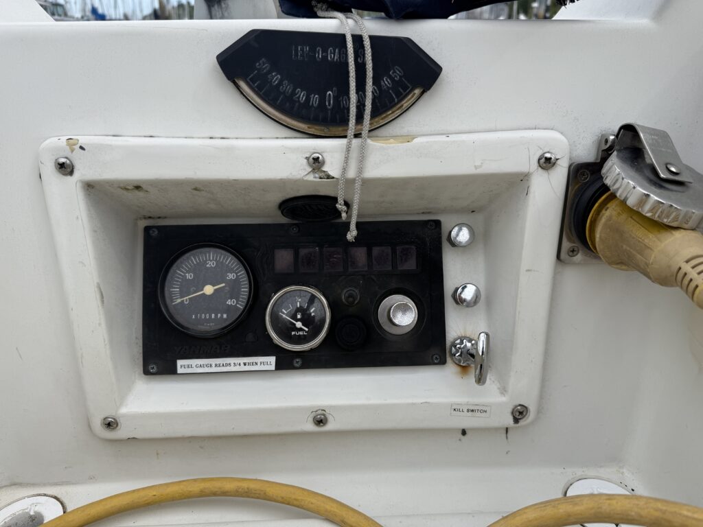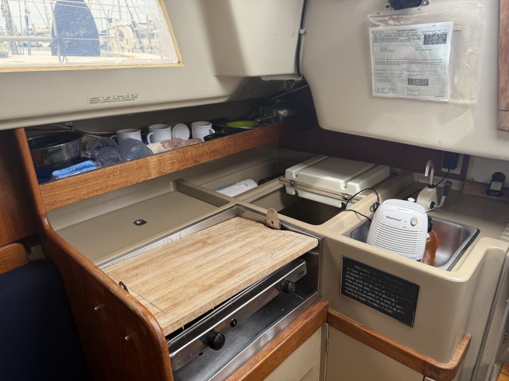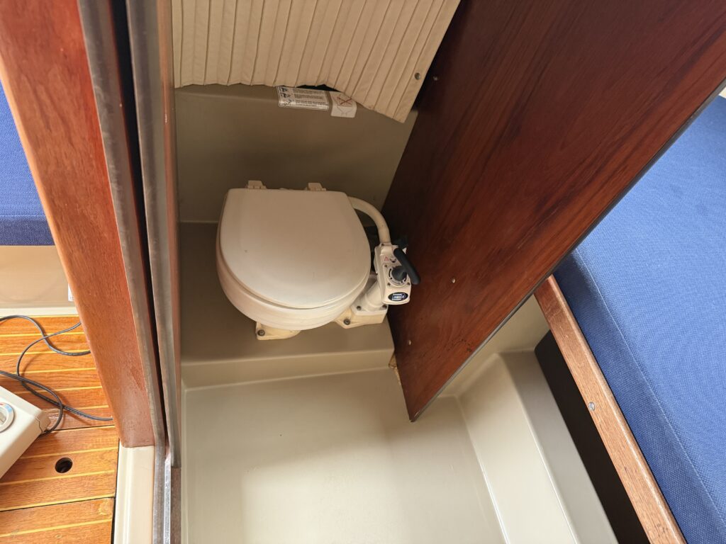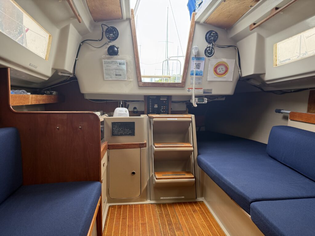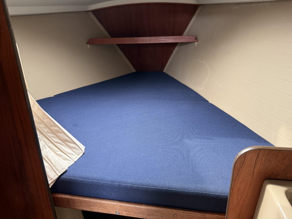 Down below, Blew Moon has a full interior: v-berth forward, settee and dinette with a fold-down teak table, a galley with a two-burner propane stove, and a head. A comfortable first boat that won’t feel like a compromise on the water.